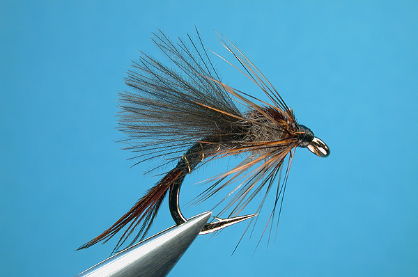 | Hackle: | Grizzle dyed red brown tied in wet fly style |