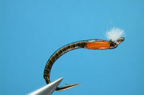| Abdomen: | Stripped Peacock quill dyed olive |