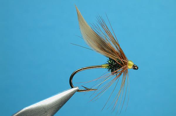 | Body: | rear third yellow thread, front 2/3 Bronze Peacock herl |