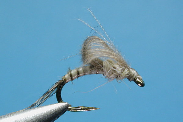 | Loop wing: | Two CDC feathers, natural grey dun, pulled over thorax, and pushed back slightly to form a loose cowl around upper thorax |