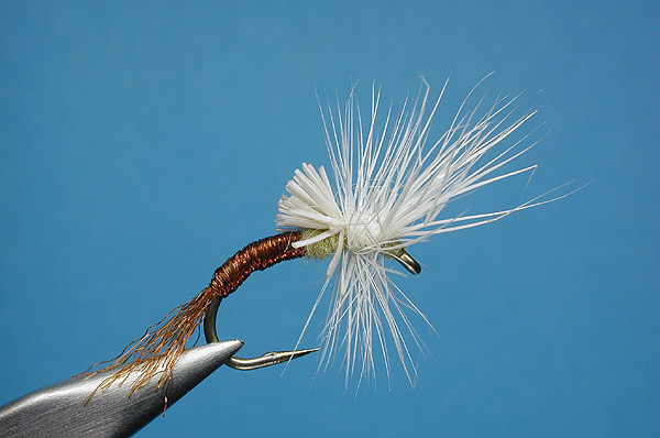 | Hackle: | Cream, three turns behind the wing and one or two in front |