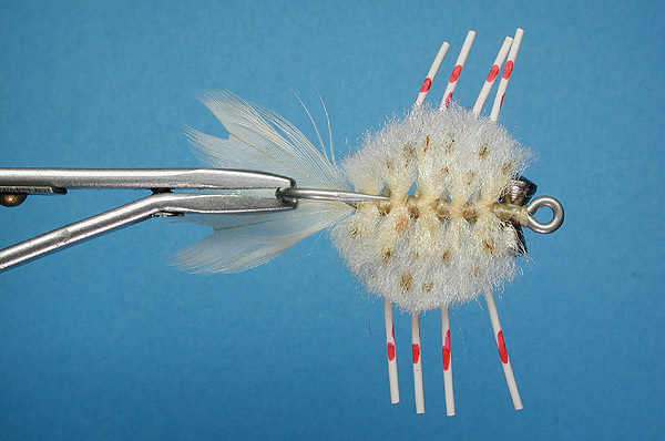 | Body: | Beige yarn hanks (trimmed to shape after fly is completed) alternating with white or natural latex rubber legs |