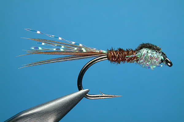 | Tail: | Pheasant tail fibers and three strands of flashabou or similar material |