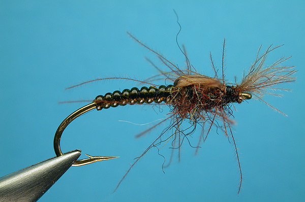 | Legs: | Dark brown CDC hackle palmered over thorax |