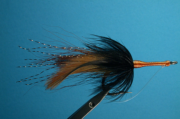 | Tail: | Brown bucktail wrapped around 8 strands copper Krystal Flash |