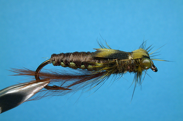 | Thorax: | Olive chenille or dubbing, I prefer squirrel, don't forget a turn around the eye stalks |