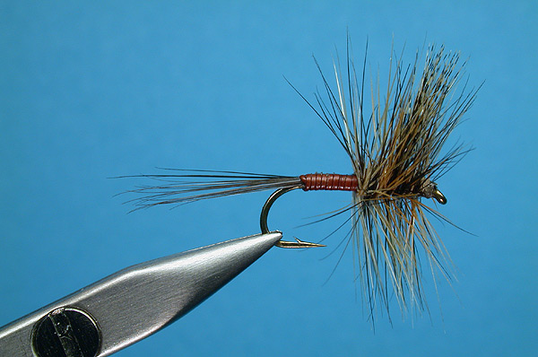 | Hackle: | Coachman brown and grizzly mixed |