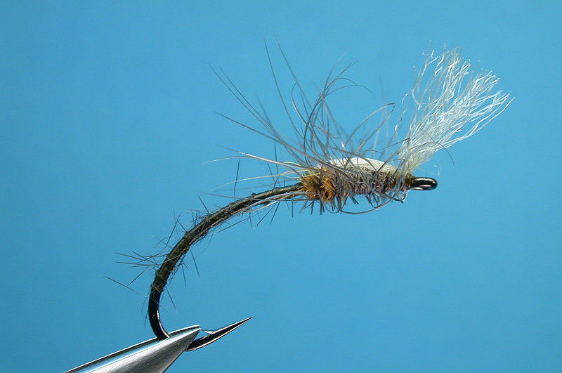 Note: The hackle is palmered along the thorax and then the wing buds pulled forwards and tied behind the eye. The hackle is then clipped flush under the thorax and the remaining fibres curled upwards. |