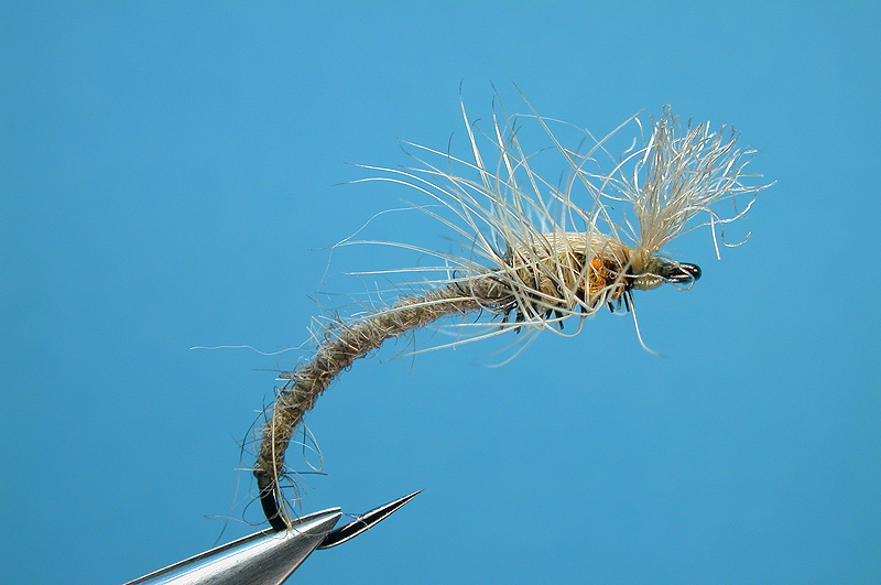 Note: The hackle is palmered along the thorax and then the wing buds pulled forwards and tied behind the eye. The hackle is then clipped flush under the thorax and the remaining fibres curled upwards. |