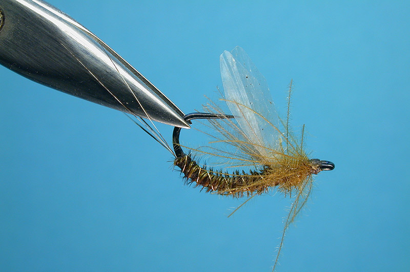 | Legs: | Olive CDC, four fibers each side to balance the fly |