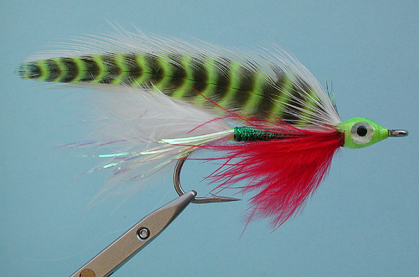 | Wing: | 6 white saddle hackle, 2 chartreuse grizzly saddle, tied in front of body braid, 4 saddle cupped in on each side |