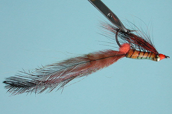 Topped with peach ultra hair, 4 strands rootbeer krystal flash doubled over thread. Feelers- 2 brown emu feathers