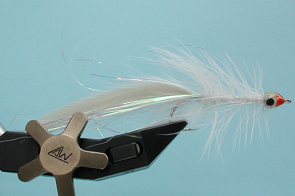 | Tail: | White buck tail, 6 white saddle hackle curving in, 6 strands pearl flashabou down sides |
