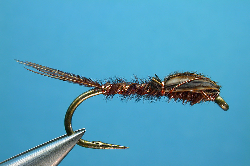 Note: This is how the originator Frank Sawyer tied his Pheasant tail nymphs. The copper wire added a little weight and most importantly some sparkle to the fly. Hints: * An oval foundation of copper wire should be wound at the thorax area, to fill it out. * There are three layers of fibers for the wingcase, making the thorax a little more substantial. * The fly is finished by making a single wrap of wire across the thorax towards the eye, where it is broken off with a half hitch. * I recommend using small amounts of superglue for reinforcing the fly. One very small layer on the shank prior to winding the body/thorax and one layer on the wire when wound across the thorax for the finishing move. |