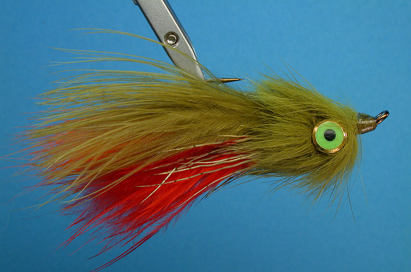 Note: The thorax and head is made from Zonker fur which is palmered using the split thread technique. Remember to use some sort of material clip when adding the fur to the thread. It would be impossible to palmer the Zonker strip with hide intact over and under the eye. The fly rides hook point up. |