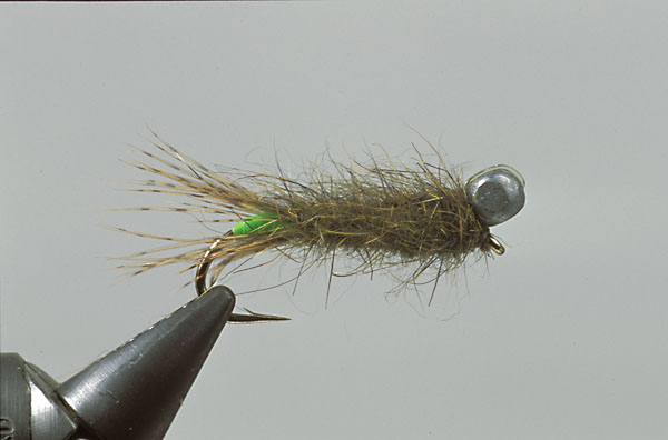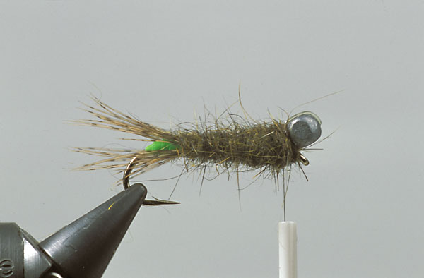 | Body: | Rabbit fur dubbed and well picked out | Variation: For the Leadhead Peeking Caddis Larva, replace the Flexibody tag by tying in a section of green micro chenille, one end singed to a taper. Leadhead - A bug for the deep I prefer fishing dry flies, terrestrials and deep surface hanging emergers to any other method. I get a greater thrill out of seeing fish coming up to take my fly from the surface than I do from nymphing or any other kind of wet-fly fishing. Sadly dry-fly fishing doesn't always work. Sometimes, it is necessary to use unweighed nymphs, wet flies, flymphs or emergers to fish just under the surface in order to be successful. That will be my second preferece. The worst thing that can happen to a fanatic dry-fly fisherman, however, is when fish are lying right down on the bottom, or are feeding in deep lies. In these circumstances my leaded bugs can be well worthwhile trying. I am not a purist although I fished dries only the first 8 years after starting fly fishing. That I only used dry flies happened more because of inexperience and because I didn't realise the value of other flies that time. The patterns I will explain in this chapter are probably the most successful deep-water flies I have ever used. I actually call them bugs or bottom bouncers. Thanks to my experience I know exactly where and when I have to go down to be successful. Some people still believe that fish are not feeding or in a taking mood when they don't rise, but most of us know that it isn't true. Statistics have proved that most food will be taken below the surface. That's why nymphs, streamers, emergers and wet flies are indispensable for fishing. A few people may see some of these larger patterns as lures or jigs but it is just the manner of their which determines what they are imitating. WHY NYMPH FISHING During my first years as a fly fisherman, I fished only with a dry fly and it took me some years to discover the value of nymphs. When I first developed my own nymphs, I never guessed how much satisfaction and pleasure fishing with a nymph would lead to. How many people worry about a wonderful fishing trip because bad weather conditions might spoil their entire plan and dreams? I have seen many frustrated fishermen sitting down beside the river bank because of situations they couldn't handle. Even if they knew that the fish were there they became locked in the rut of their favourite and most successful fishing method. In my opinion there are still a lot of fishermen who are afraid or don't know how to experiment. Creativity, insight, initiative and knowing how to read a river avoid a lot of frustration. Fishermen who can be freed from traditional regulations, techniques and suggested patterns can be very successful in difficult circumstances or when everyone fails. Because I grew up without any fly fishing tradition and history I may see it more objectively and that's why I can accept it when fishermen are using different fishing techniques and methods. During the years I learned to value other fishermen's techniques; methods that were completely new for me or techniques which where very special. It is not wise to argue against any method before you talking intensively with the fisherman who is using it. Try to find his thoughts and ideas behind it, you never know, maybe his arguments can even widen your skills. This is why I started nymph fishing, I believed in the ideas of somebody else. The joy of nymph fishing came with the success. Catching fish in the most difficult circumstances gives me a very good feeling and stimulates my self-confidence enormously. Confidence is probably the most important key for a fly fishermen. I also think that the search for more selective and hard to catch fish is also a matter of experience and development. As I grew older I looked not only for quieter fishing places but also for a greater challenge while in the beginning of my fly fishing experience the catch was the most important. Catching fish meant I was doing right. As growing older the catch was not the most important factor any more, although I am still very happy when I hook some good fish. I prefer to catch just one real specimen above a great number of smaller fish, even if it takes me some days. I guess today I belong among those who can say I had a wonderful fishing day only the catch was poor. During my yearly fortnight grayling trip to the Glomma river in Norway I sometimes caught only one fish above 50cm. This fish makes my entire trip. When fishing I am completely wrapped up in the beautiful scenery and wildlife. I have grown into it and only because of this attitude can I handle hopeless situations over a long period. On high water conditions or in extremely bad weather, when fish are difficult to catch, I have learned that nymphing is usually the only successful method. THE KVENNAN SPECIAL Around 1980, I tied only a few nymphs for fishing in Holland and to practice my tying skills, but because of the good results I had been getting with the dry fly abroad, I was seldom prompted to use them. The first time I was seriously confronted with nymph fishing happened during one of my summer holidays in the early eighties when I met some Swedish fly fishing fanatics at the Glomma river in Norway. I usually fished in the areas around Koppang, Atna and Alvdal, but the interest in new fishing grounds and fishing pressure in that region drove me further upstream. I found a nice camping place between Tynset and Os; an area more than once described as one of the best grayling waters in Europe. In less than one hour after putting up our tent I had befriended a group of fly fishermen who already fished a couple of days and knew exactly where, when and how to tackle the river. When they invited me to accompany them during their nightly trip, I didn't realise that this was the beginning of a completely new experience. With this group, I fished one of the most beautiful beats of that area of the mighty Glom