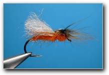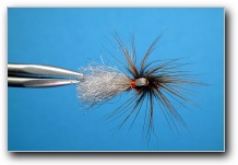 Parapoly Sedge In the beginning, it seems that other people had much more success with this pattern than I had myself. The Para Poly Sedge I developed just a few weeks after I made my first Klinkhamer special and this fly had a really bad start. Although, I specifically design this fly for a river which abounds with large sedges, I never got the chance to test it in any objective way. In the years that I visit that particular river there was so much water that the fishing was hardly effective. The wading was difficult -even dangerous- and the best pools were completely flooded. Fish were almost impossible to spot. They were probably the worst conditions in which I ever fished this place. Whatever the circumstances, however, I still attempt some fishing, but on that occasion and not surprisingly, without any success. Every fair fly-fisher must agree that one cannot condemn a river as poor just because one's first experiment of it is under poor conditions. I was right because a few years later, I did very well on that river in much better weather conditions. So the Para Poly Sedge (P.P.S.) stayed in my fly-box for quite a long time without getting used very much. During trips and in conversations with other anglers I gave away quite a few flies and a few of these were PPSs. Two years after I first tied it, my attention was drawn back to the pattern in this way. It happened after I had received an enthusiastic letter from a fanatical German fly fisherman. I had given him one or two PPSs to try on Scandinavian waters. He and his friends had done extremely well on the fly indeed, he had enjoyed his most successful trip to Norway and Sweden, thanks largely to this pattern. The PPS had become his favourite fly by far and to-day he kept a box full of it in many different colours. The same year, another letter reached me reporting favourable words on the pattern, this time from the U.K. After that second letter, I decided to give the fly closer attention and I try it out intensively in various parts of Europe. This time my own results were much better. Most spectacular of all, I did particularly well on grilse and sea trout in small Norway rivers. I even got some good success for seatrout during coastal fishing in estuaries at the Norwegian coast! The fly must be fished in the water-film, with the polypropylene yarn wing above the surface. The fly float very well and can be fished in drag-free drifts and with upstream retrieving techniques. The parachute hackle in front give some special attraction to this fly and leave a nice wake if the right retrieving speed will be used. During the years I also found out that some success can be obtain when the fly is fishing just under the surface during an upstream retrieve. Then I usual start with a down-stream drift and fish the fly back just under the surface. A deadly methode for many fish spieces. Tying sequence