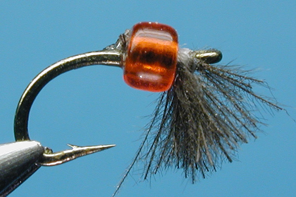 This is a simple pattern that I thought up after reading for the umptieth time, in one of several British magazines, that due to their small size, Daphnia cannot be imitated, but daphnia-feeding trout can be caught on orange lures. I tied this thing up to show that Daphnia can be imitated. A globular orange translucent body can be approximated with a glass bead, and the mobility of the daphnia's legs can be had through CDC fibers. Some CDC fibers are tied to the underside of the hook, behind the eye, pointing forward. The legs are directed downward by making a thread wall in front of them. The thread is then tied off, and a small glass bead is slid onto the hook and secured with superglue or cement. In this size, the fly is slightly larger than a Daphnia magna or pulex, but smaller than a Ceriodaphnia dubia. With smaller hooks, a true-size D. magna can be obtained, if at all necessary. |