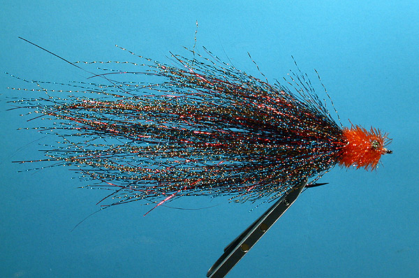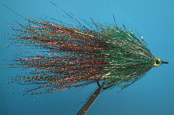 Note: Single hook pike flies need a 3/0 to 6/0 hook. Longer shanks negatively influence the hooking power of the fly. These flies are made with large size wire brushes made with any type of thin flash material. To build a taper into the body, the flash material is cut up into bunches of different length, and put between the brush wires from long to short. Twisting the brush can only be done on a large dubbing brush machine, in which the support can be removed when twisting, such as the roots machine or the twister. A wire pet fur brush is an indispensible tool when making such brushes. The brush should be combed out continuously while twisting, starting as soon as the wires have gripped the flash material tightly enough so that you do not tear it out when combing. You can either make a fly with one brush body and a fritz (estaz, ice chenille, or whatever name it is known under) head, or with a double brush body and an epoxy head with stickyback eyes.