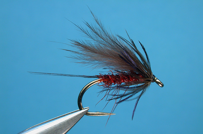 | Wing: | Fluey hackle barbs from base of stem, grey |