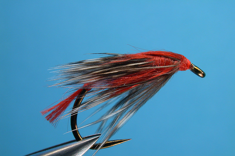 | Thorax: | Whiting Brahma hen saddle feather, mottled; ultra-fine polypropylene yarn, scarlet, short section in split thread - twisted together |