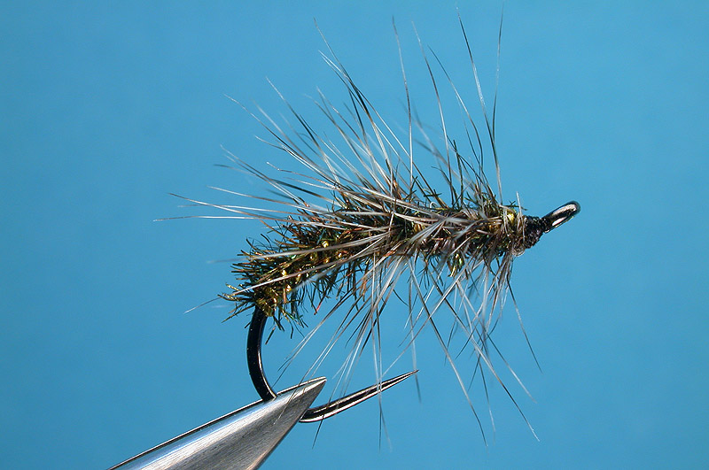 Polar flash, gold; peacock herl; hackle, grizzly - twisted