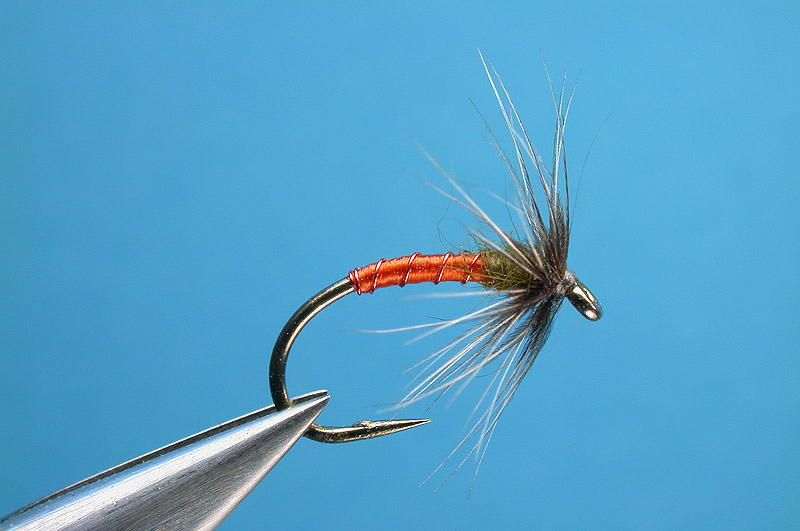 | Hackle: | Whiting Coq de Leon hen, dark pardo |