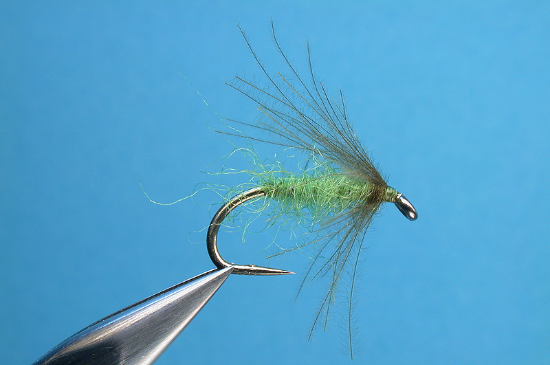 CDC barbs, dark olive, inserted into split thread