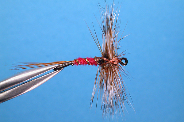 | Hackle: | One each of greyish, poorly marked, grizzly and Rhode Island "red" |