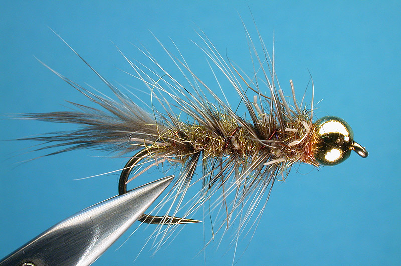 | Body: | Dubbing bush with twisted copper core, olive natural dubbing with added flash |