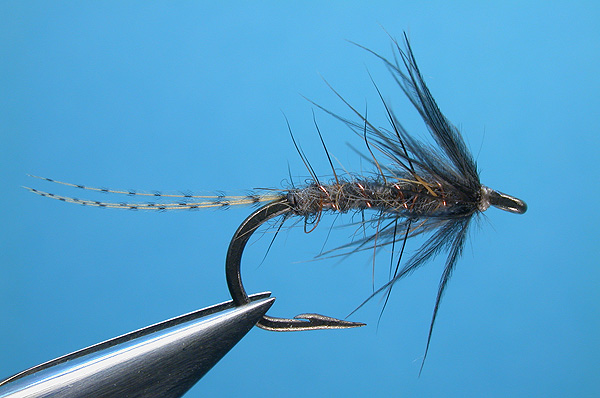 | Hackle: | Starling body feather, tied in behind the eye in the “reverse hackling” method |
