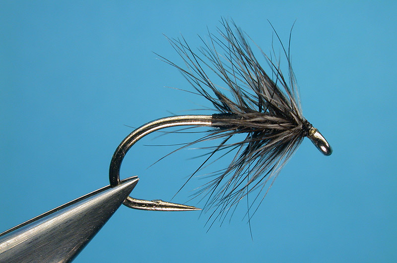 | Hackle: | Hen hackle, grizzly - twisted together with tying thread before wrapping |