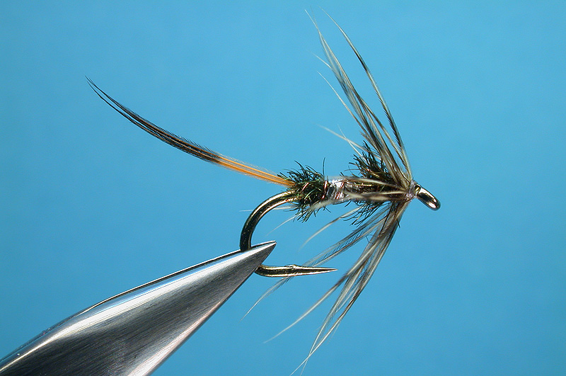 | Body: | Peacock herl, embossed tinsel, peacock herl - three equal segments |