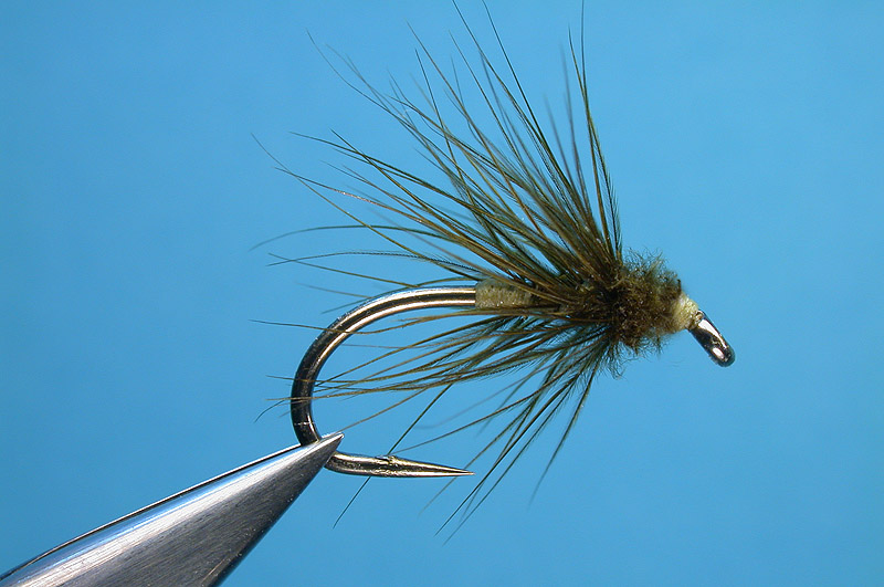 | Hackle: | Hen hackle, dark olive - twisted together with tying thread before wrapping |