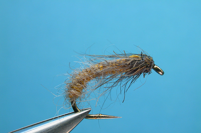 | Abdomen: | Narrow amber ribbon from produce bag, doubled into loop, marten underfur inserted, corded |