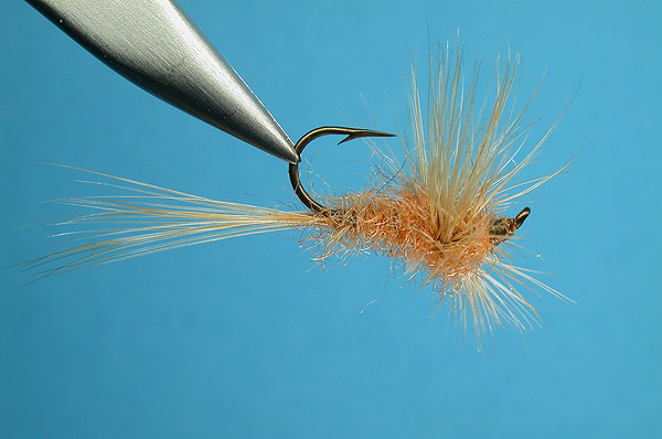 Tying notes: This style of tying makes the fly land upside down and float on the surface rather than in it. After the abdomen is tied a short dubbing loop is tied in right at the thorax and just before the hackle is tied on. The dubbing loop is twisted, but not wound on. It is held in place with a twist-tie fastened to the vise. Wind on the hackle in the normal fashion, but leave more room than normal near the eye of the hook. Then, the final stage is bringing the dubbing loop over and through the hackle, brought