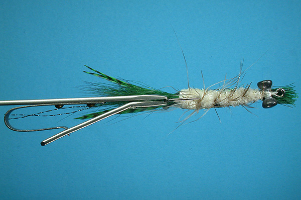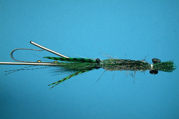 | Claws: | Dark green grizzly hackle tips |