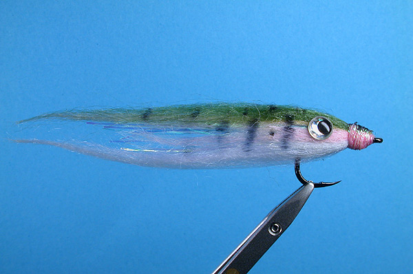 | Body: | PolaFibre stacked, tied in behind the eye. Olive over Pink over White |