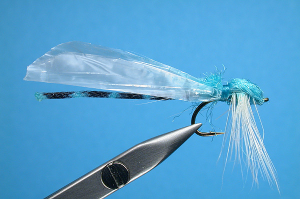 Except for the wings and hackle this fly is tied with all white material. Use blue marking pen to color thread and other white materials as you tie. Large white or cream tied parachute around the thorax body. Body material is then pulled forward and tied at the head, then folded to the rear and tied off at the rear of the thorax splitting the hackle to each side. |