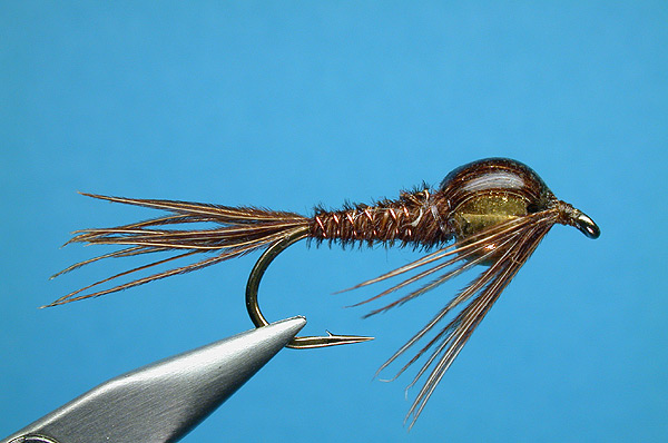 | Thorax: | Brass Bead (Gold) with pheasant tail pulled over the top and epoxied |