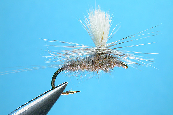 - Tie in the grizzly hackle at the post. Bring thread behind the eye and let the bobbin hang.
