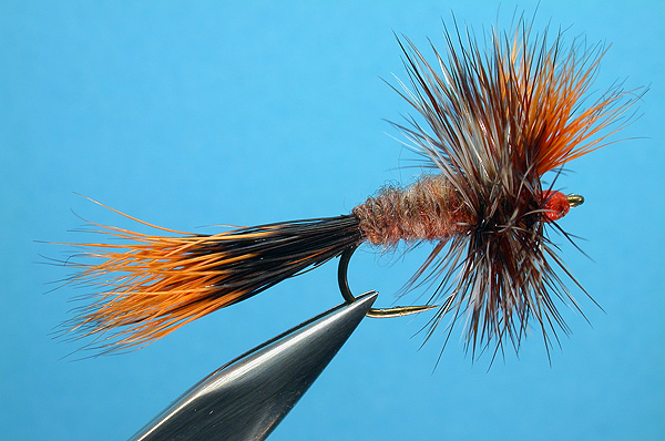Note: While cleaning out a drawer of fly tying materials in the summer of 2000 Dick Talluer created this design. He found some woodchuck, envisioned some Wulff-style dry flies and went to work. Up right wings with woodchuck, thus the name the “Up Chuck”. The pattern and the story behind it are in the May/June 2003 issue of American Angler magazine. “The reason for the orange thread is that when the fly gets damp, the thread will glow and enhance the body color.” Dick gives credit for this idea to Francis Betters and his Ausable Wullf pattern.