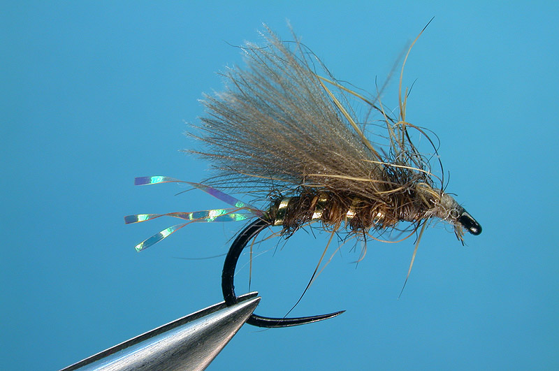 | Thorax: | Scruffy Hare hairs lightly dubbed over thorax area |