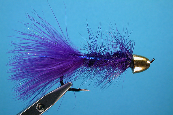 Note: A friend of mine requested this fly. A Purple wooly bugger with Blue lateral stripe. The blue tinsel or flashabou shows itself when sun is out and then calms down when cloudy. Nice subtle color changes when fished. Try different color combinations. |