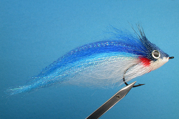 | Tail: | White islandic sheep (or Umqua Streamer hair) for bottom, blue Umqua Streamer hair & dark blue Orvis Fly Fur on top. Pearl Kystal Flash on side & Blue Kystral Flash on top |