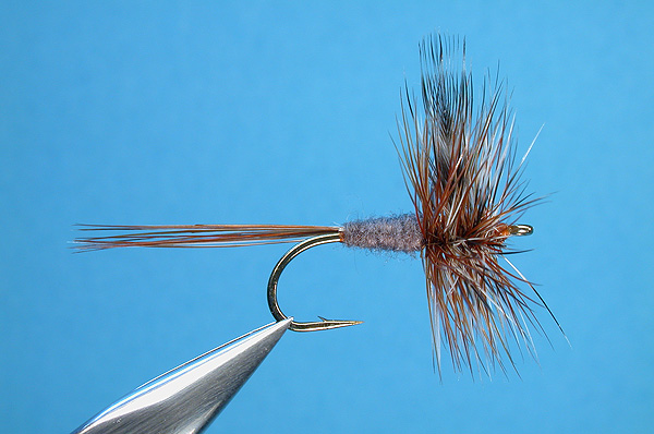 | Hackle: | Brown and grizzly mixed hackle |