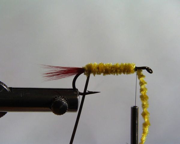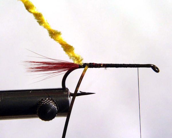 Tying instructions: Step by step photographs - John Morton Place hook in the vice, holding the hook at its bend in the vice jaws and the point covered by the jaws. Hook Size Streamer Flies are usually tied on hook sizes between #8 to #2 or larger. The choice can be left to you. I prefer the medium size of #4 hook for my Streamer patterns with smaller flies for smaller waters, and large flies around #2 for night fishing or for heavy flows. Another rule of thumb is to use larger flies early in the season when the waters are traditionally higher, with more volume. Use smaller flies in low water summer conditions. *** The Underwrap *** At the front of the hook, observing the space reserved for the head tie area, lay on a close wound bed of thread along whole length of the hook to a point above the halfway mark between the hook point and the barb. While winding, hold the short end of the thread in the left hand; taut, and at a slight rearward angle. This will pack each wind of thread to form a tight underbody that will not roll. This is the basis of all flies you will tie. Thread underwrap finish point should lie ha halfway between hook point and the barb as shown ![]() *** The Tail *** Hold a dyed red rooster feather in the right hand, by its tip. Stroke this feather with the left hand to `stand out’ all the barbules at right angles to the center spine of the feather, strip off the soft flue base of the feather. Take a quarter inch pinch of barbules between the thumb and forefinger of left hand, and tear off with a rearward movement. These spicules are to tie in as the tail material. For correct proportions the tail length should be the same length as the bed of thread along the shank of the hook. Fix the red barbule tail material over the last underwrap of thread with three `fixing loops’. Cut off the feather butts and wrap in butts firmly. Return thread to the rear of the hook to lie over the last underwrap, thoroughly and firmly tying down the butts of the red feather spicules. If you lift the tail at this point you should not be able to see any black tying thread showing under the tail. If you can, gather the spicule’s in your left hand and wind a few more rearward turns to place the thread in the right position for the next move. ![]() *** RIB and BODY *** Take a five-centimeter piece of yellow chenille and strip a quarter inch of chenille away, to expose the twin cotton center core. Tie in this center core directly over the first tie down wrap at the start of the tail. Tie in a five-centimeter strip of oval tinsel with three `fixing loops’, about a millimeter in front of the chenille. Tie in chenille and tinsel butts firmly, and advance thread to the eye of the hook. ![]() Apply a liberal coat of cement over this wrapping for extra strength and wind the chenille to the hook eye, using tight, closely wound wraps. Use either your fingers or hackle pliers for this. Tie off, and clip away excess material. Remember not to move into your reserved head area at this point with anything other than tying thread ![]() Take four honey grizzle feathers and place together two feathers for each side of the wing (four feathers in all), so the concave (curved) side of each pair of the feather’s lie facing together, with the tips all meeting together. The wings are then mounted over the hook using the right hand to measure the wings for size. The correct proportion is two shank lengths of the feather extending rearward from the tie in point, or to put it another way a tail length beyond the fly tail. Clip off the surplus feather, hold the wing group by the tips and strip out all loose spicule’s at the butt ends you have just cut, and align all wing feather center spines so the wings all lie together in a straight line with the tips facing rearward. Take the wings in the left hand and place in position over the reserved head area to tie onto hook with the first `fixing loop’ tying down at the rear of the space left at the hook eye. If the feathers are properly positioned, the ends of the butts should not obscure the hook eye. If badly positioned and the butts do extend over the eye, then trim off excess butts, and bind down neatly to form the start of a good flat head taper. ![]() Finishing the rest of the Wing, and Rib with Tinsel Return the tying thread to the start point of where the wings were tied in, binding down the wing butts. We now wind in the tinsel. Take one wrap of the tinsel round the hook shank, over the tail and bring it up into the chenille bed. The tail of your fly will stay in position with the feathers correctly aligned if your first rib tie-down is bedded in the chenille body. Leave the tinsel to hang underneath the hook shank attached to a pair of hackle pliers. It is most important to take care with this last move, or the wings will not lie along the hook shank properly when bound down. To effect the ribbing, stroke the wing feather tips together neatly to align them before grasping them firmly at their very tips with the left hand. With the right index finger in the eye of the hackle pliers, pull the tinsel up vertically and keep it taught. Adjust the distance between hackle pliers and top of the hook if necessary so that the thumb and third finger of the right hand can reach down comfortably to work with the wing. Stroke the wing feather spicule’s forward with the thumb and third finger of the right hand to make an opening in the feather wing. This opening should be exactly at the point where the vertically held tinsel touches the wing. With the left hand holding the tips of the wing pulled tightly rearward, move the right hand slightly away from you so that the tinsel passes through the opening just made by the thumb and third finger. Release the thumb and third finger of the right hand. ![]() Now, release the left hand holding the wing tips, move this hand forward to the tinsel for the next move. To rib the wing properly, carefully comb the opening that the tins