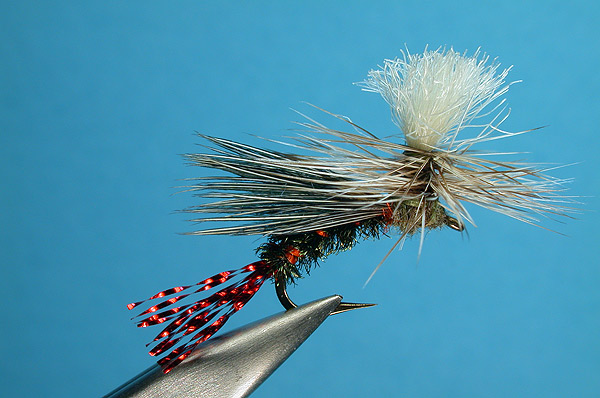 | Hackle: | Dun grizzly, tied parachute style |