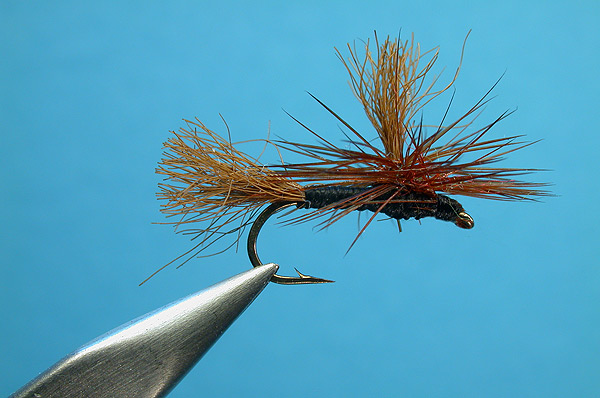 - Tie in the Hackle Shiny Side Up. Wrap 5 or 6 turns of hackle round the base of the wing with each turn Positioned under the one before. Tie off the hackle and trim off any excess material.