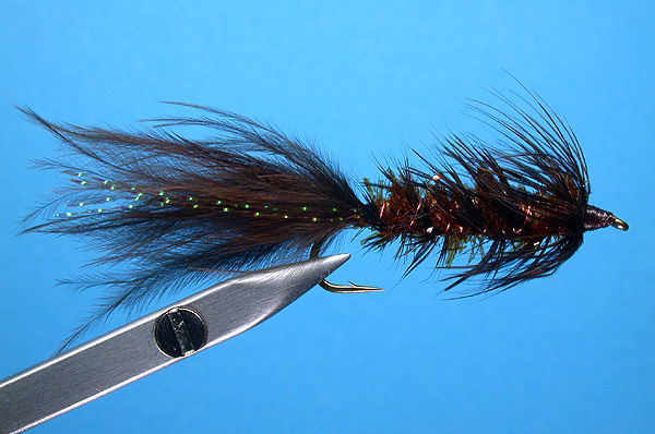 | Hackle: | grizzly dyed brown schlappen hackle, reverse palmered and counter-wrapped with copper rib |